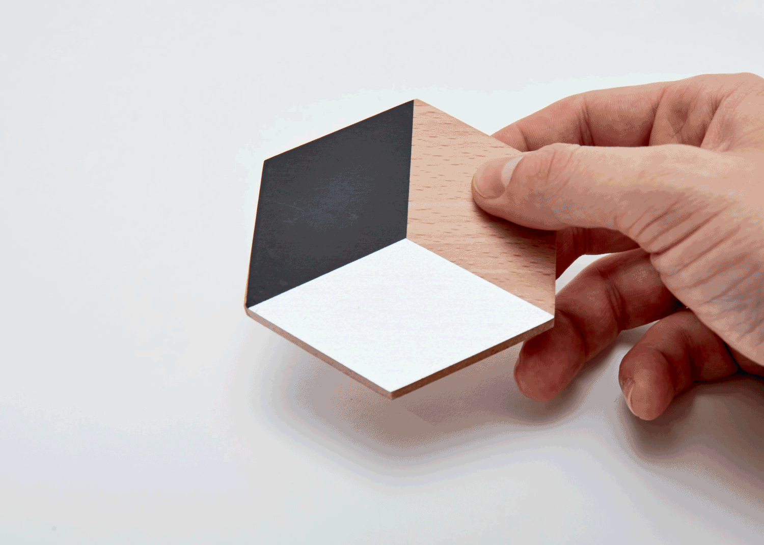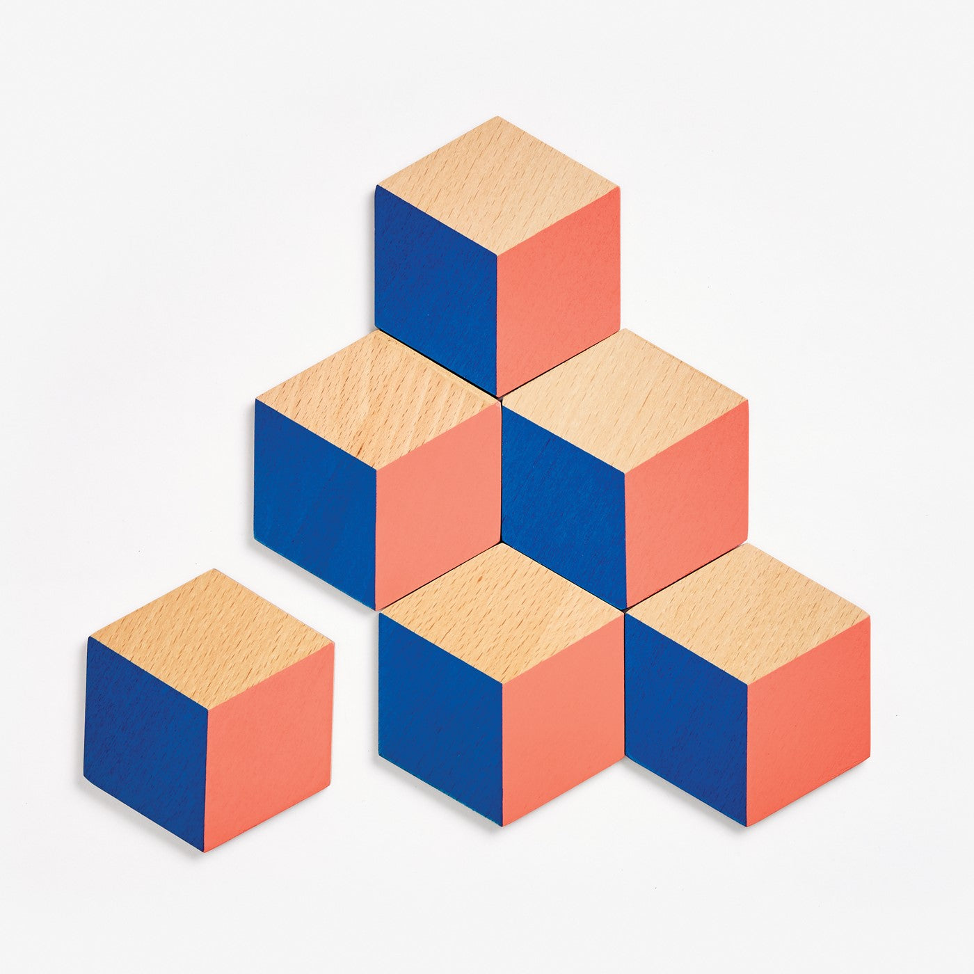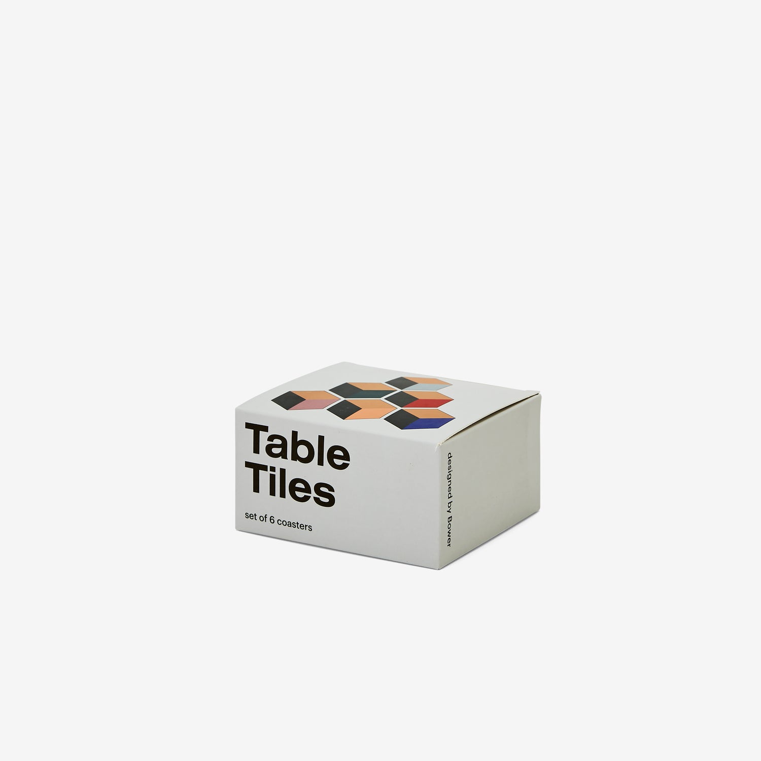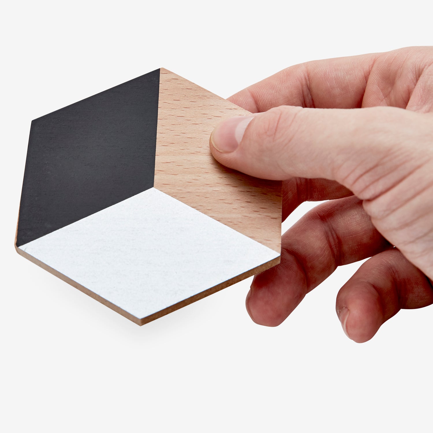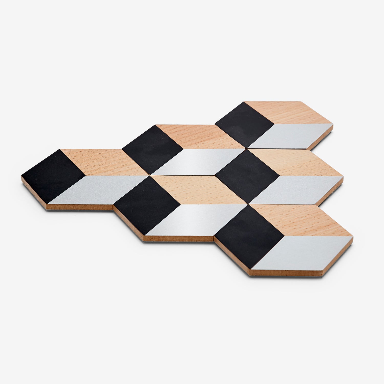 This set of six coasters can be used separately or artfully arranged to form a tiled trivet. The illusion of 3D through colour and geometry allows for endless permutations, encouraging playful mosaic building on your table.